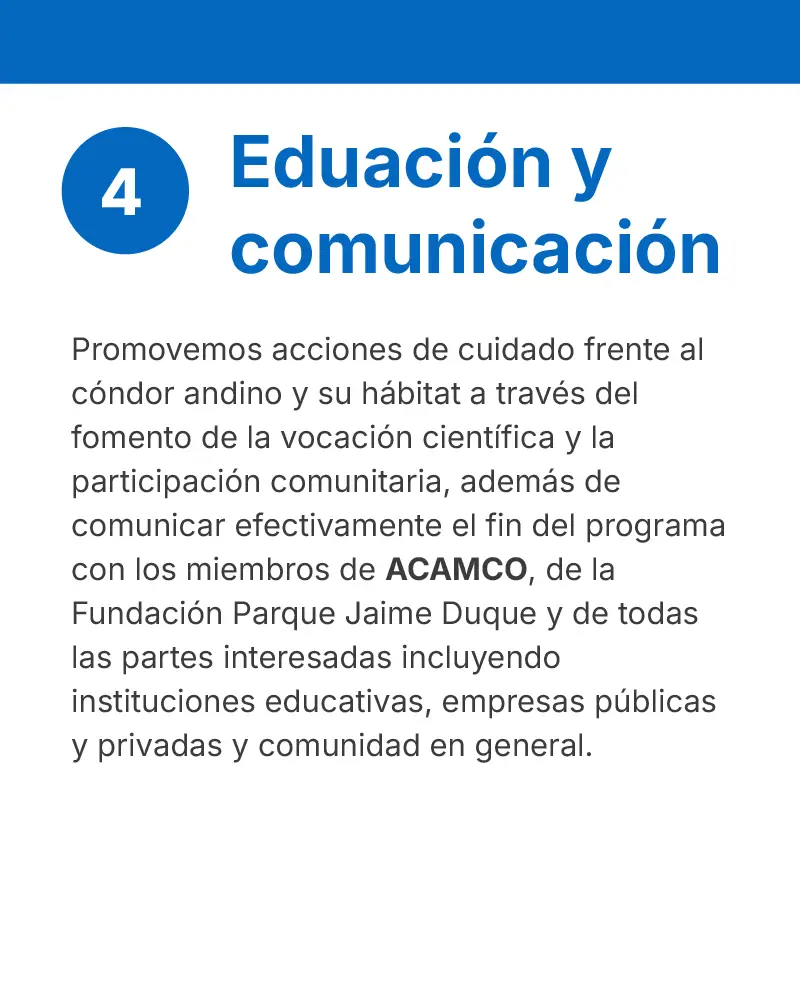 Nuestro programa se desarrolla en el páramo El Almorzadero, específicamente en San Andrés, Concepción y Cerrito, municipios del departamento de Santander. Allí, junto con los habitantes del páramo a través de la Asociación Campesina Coexistiendo con el Cóndor – ACAMCO, impulsamos la transformación de los sistemas productivos tradicionales extensivos de ovejas y cabras, que ponen en riesgo la disponibilidad de otros recursos naturales como el agua. Esta es solo una de las estrategias del proyecto; la conservación ex situ (cría bajo cuidado humano y profesional), conservación in situ, educación ambiental y comunicaciones y la producción sostenible componen este programa.